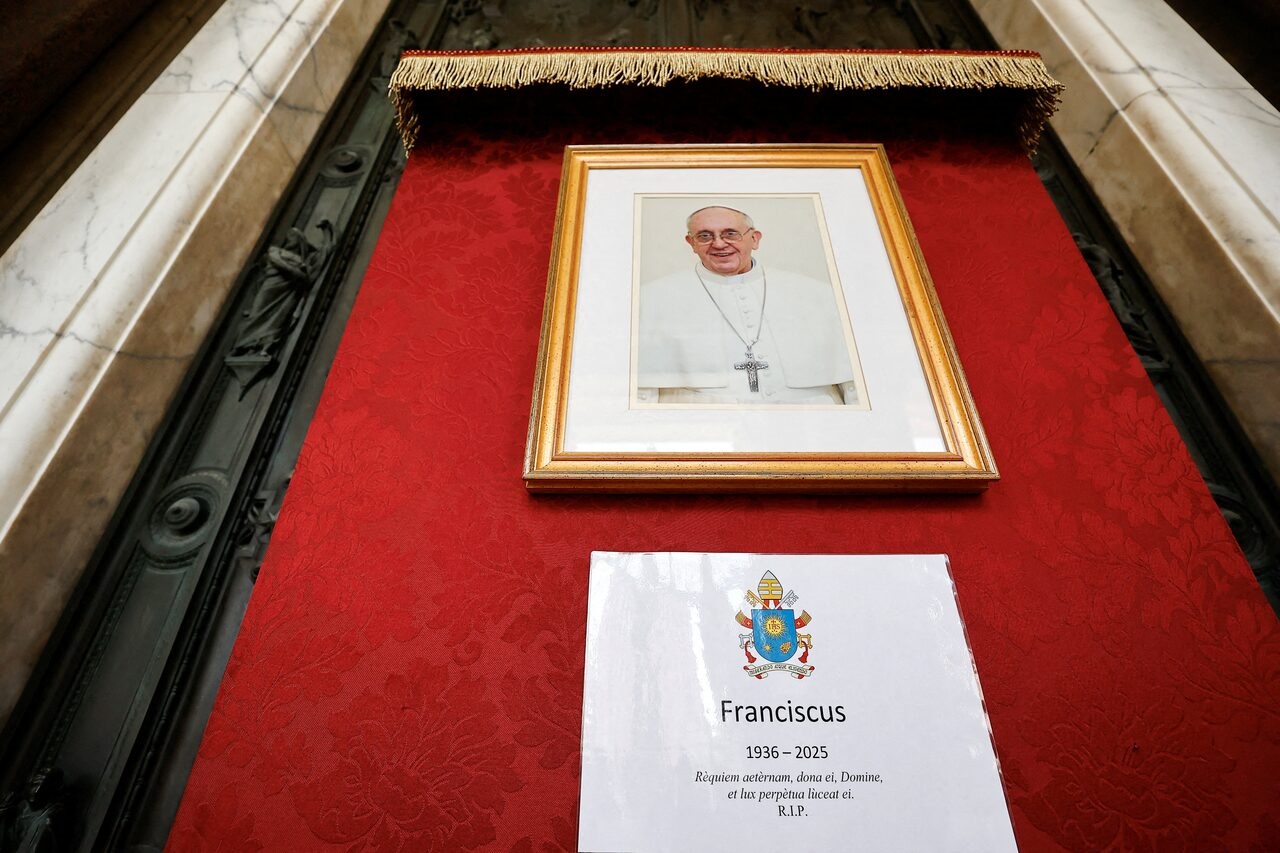 Foto: una imagen del papa Francisco e información que incluye el año de su nacimiento y el de su muerte, en la basílica de Santa María la Mayor, en Roma, Italia, el 21 de abril de 2025. Vincenzo Livieri/Reuters.