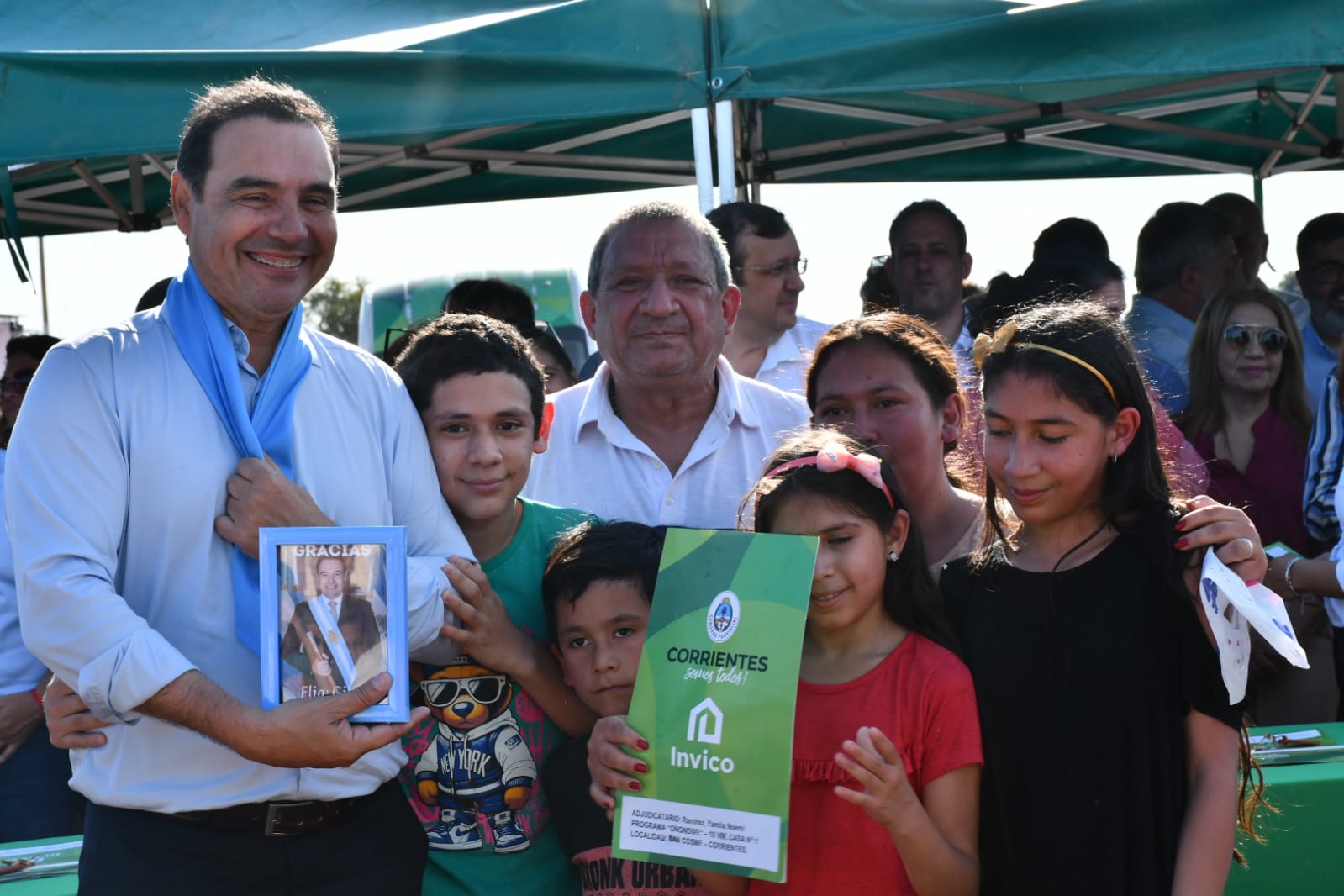 El gobernador Gustavo Valdés entregó este jueves 20 viviendas del programa provincial Oñondivé en el barrio Matadero de San Cosme y habilitó 13 km de ripio en la ruta provincial N.° 1 de la localidad.
