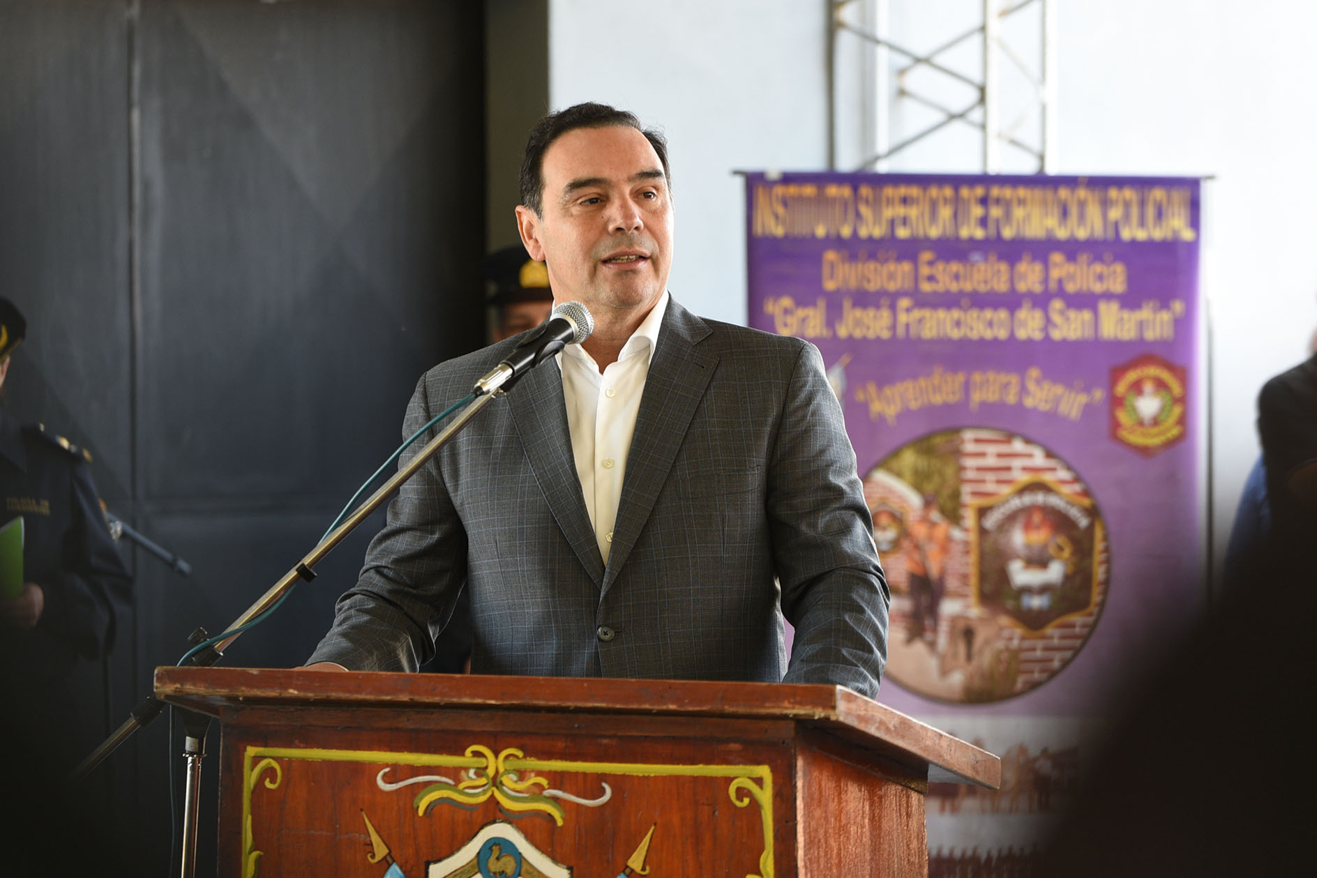 El gobernador destacó la extensión de la enseñanza en la Escuela de Policía “de 2 a 4 años” y aseguró que los desafíos para la fuerza policial son cada vez más complejos. “Hace tan solo dos años no teníamos inteligencia artificial. El delito ha evolucionado notoriamente y también debemos hacer las adaptaciones legislativas fundamentales para los tiempos que corren”, aseveró.