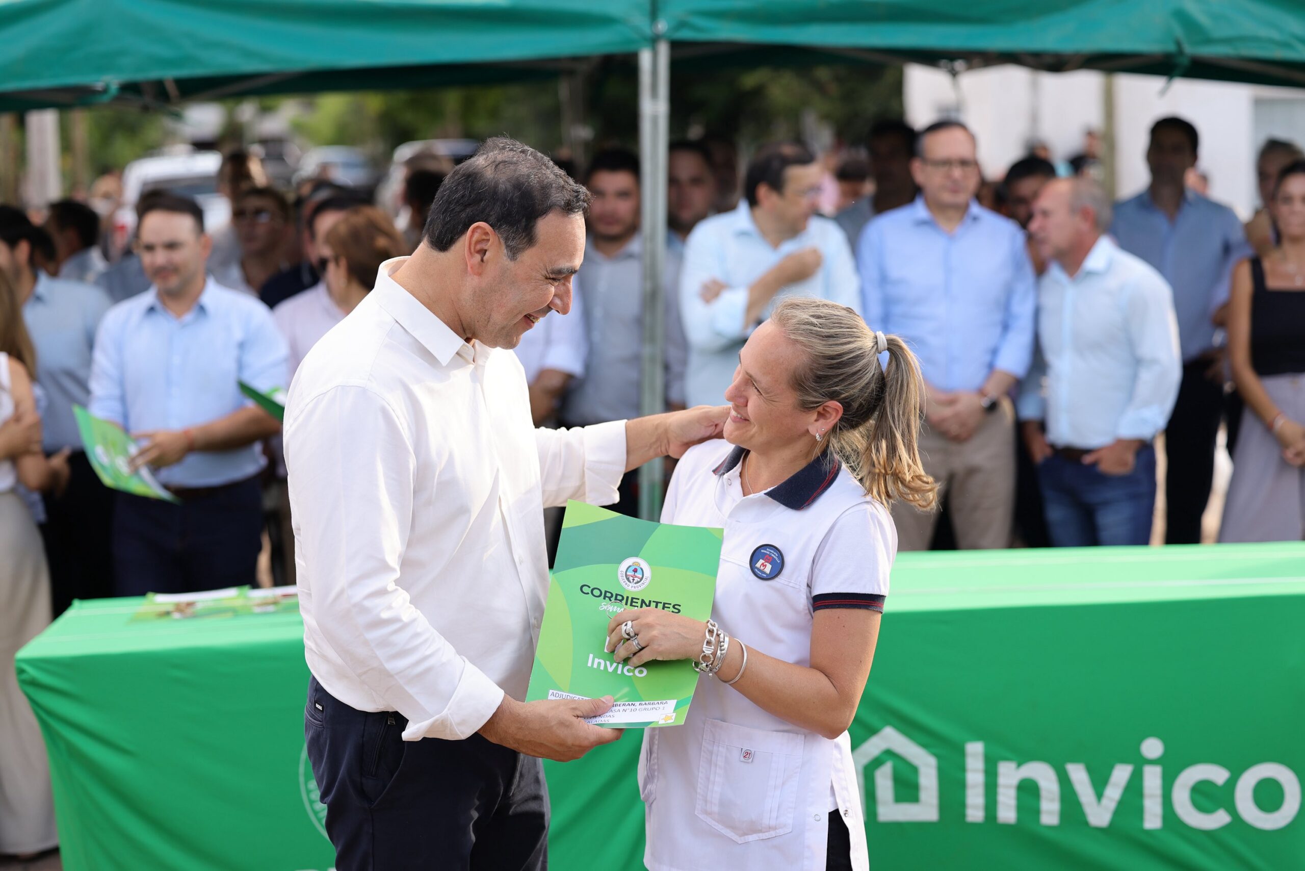 El gobernador Gustavo Valdés entregó este martes 10 viviendas del programa provincial Oñondivé en el barrio Bomberos Voluntarios, en Tatacuá, en un acto en que remarcó la importancia de sostener políticas habitacionales con recursos provinciales y una visión social.